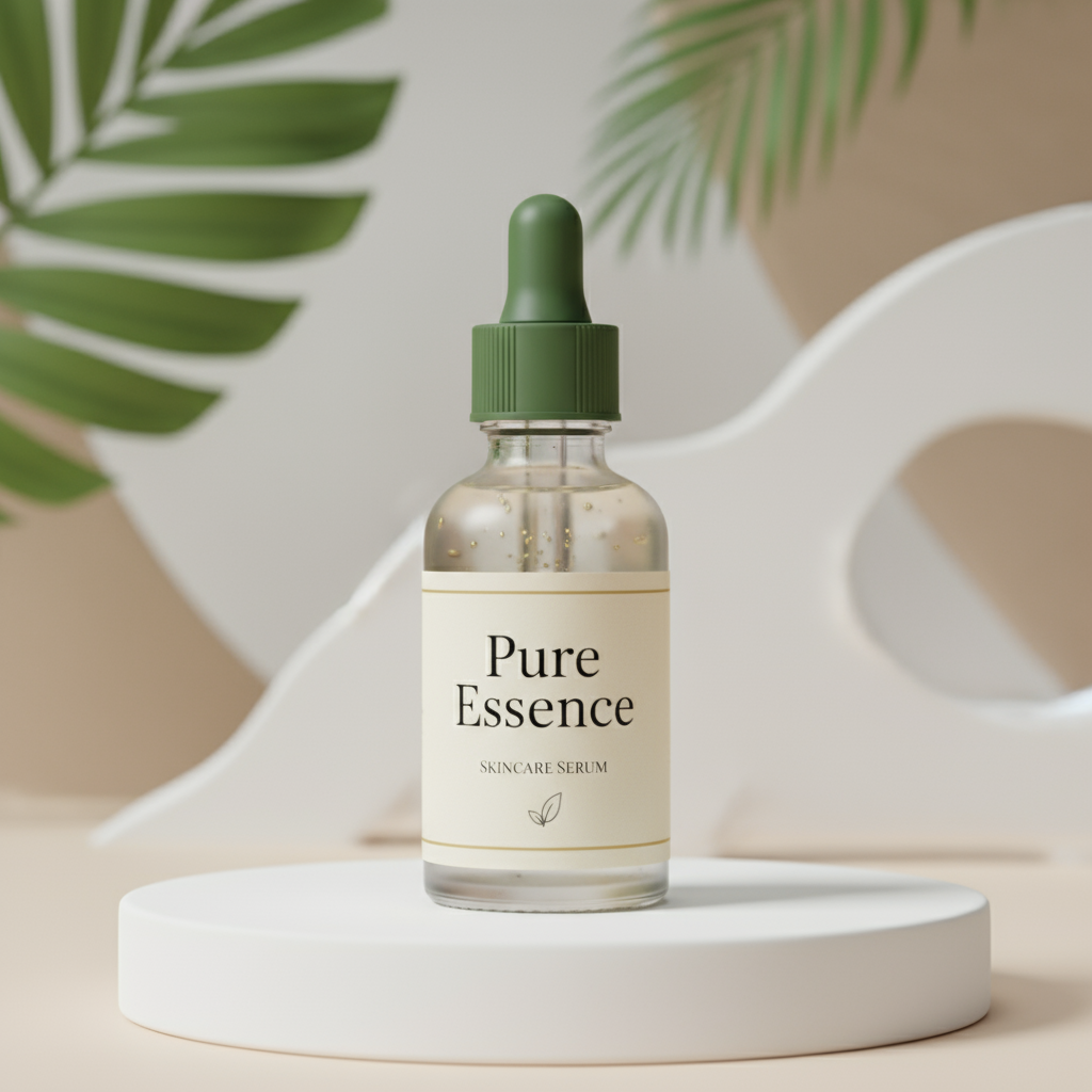 Realistic_4K_3D_product_image_of_a_skincare_serum_labeled__Pure_Essence__in_a_glass_dropper_bottle_w